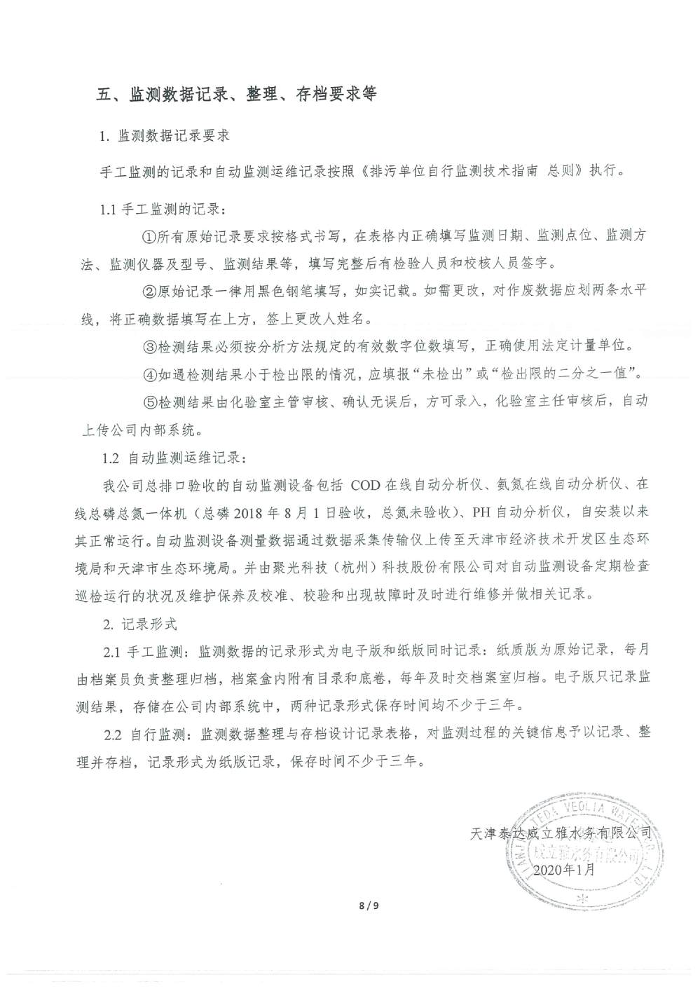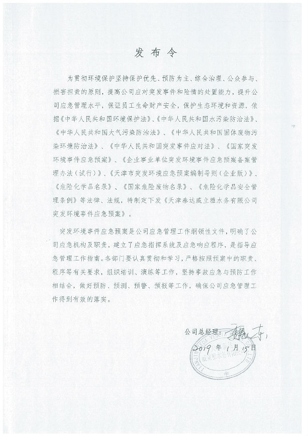 我公司根據《中華人民共和國環境保護法》以及《天津市突發事件總體應急預案》等相關文件要求,于2019年1月編制(修訂)完成了《天津泰達威立雅水務有限公司突發環境事件應急預案》,2022年7月19日完成變更備案并發布(備案編號:120116-KF-2022-117-L)。